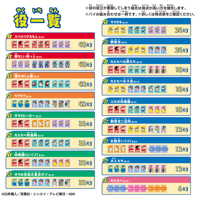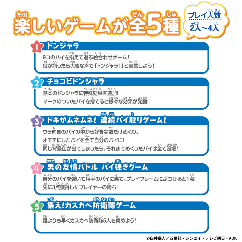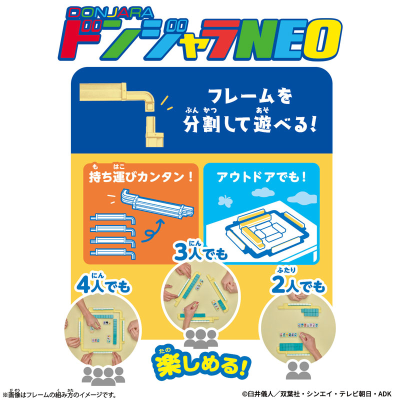 出自小巧便攜的「Donjara NEO」系列,Donjara NEO 蠟筆小新系列隆重登場,滿載著《蠟筆小新》系列中熟悉的角色!框架可拆卸,方便收納,同時保留了與家人朋友一起玩樂的樂趣。它便於攜帶,讓您隨時隨地都能與任何人一起享受“Donjara”的樂趣!本系列包含五款適合兩人或以上玩家的遊戲,從經典的「Donjara」到《蠟筆小新》獨有的特色遊戲,讓您與熟悉的角色們盡情玩耍!