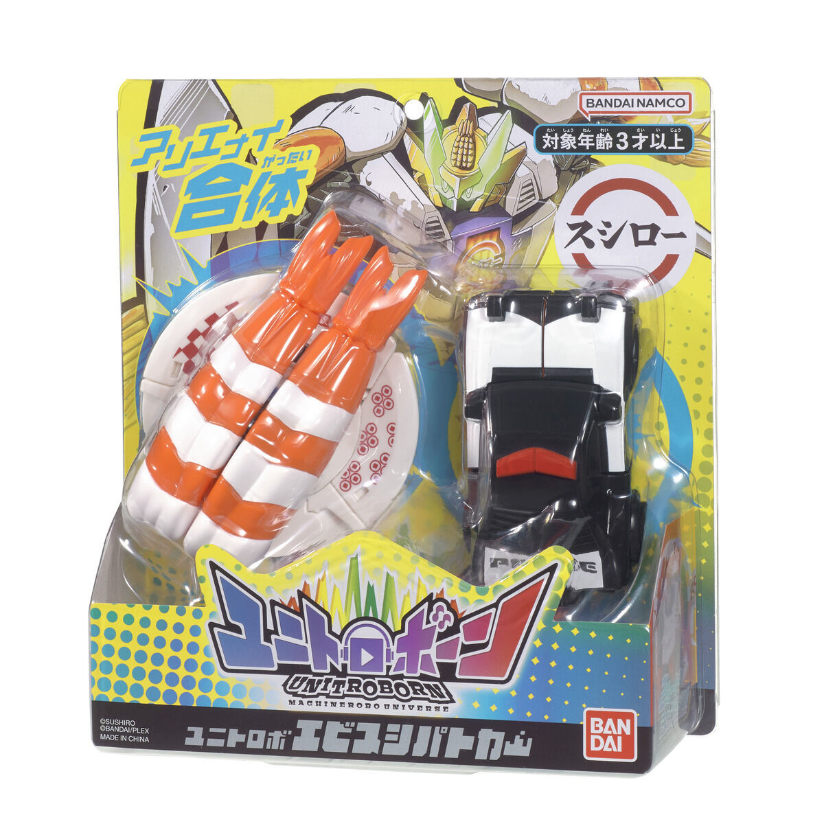 出自機器人系列《Unitroborn》,一個可以將任何物品合而為一,創造出令人印象深刻的角色轉換的世界!這次,該系列推出了蝦壽司和巡邏車的組合,兩個獨立的人物可以合而為一。