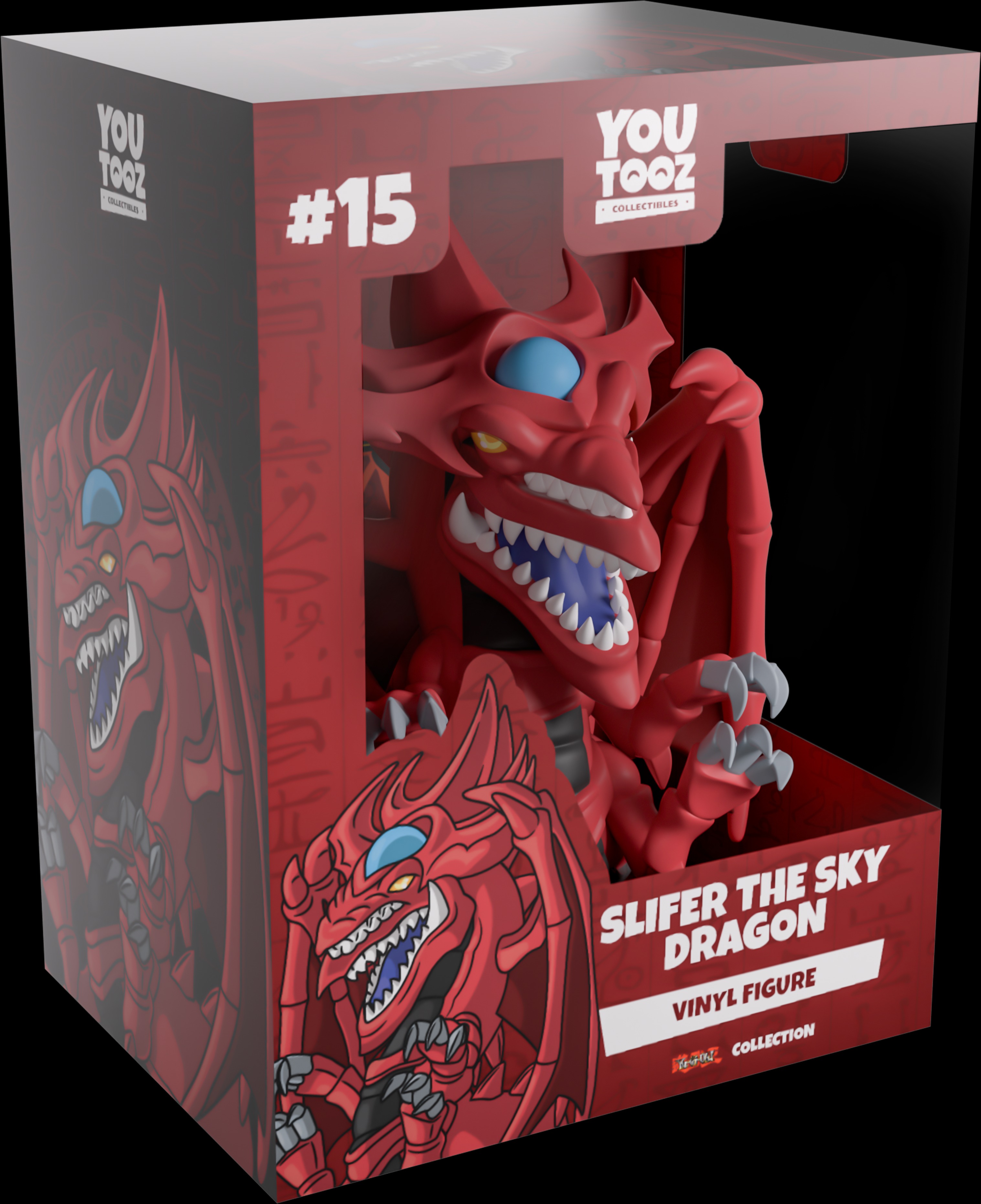 我們召喚了法老阿特姆,召喚歐西里斯的天空龍 (Slifer) 來在 YouTube 上首次亮相!歐西里斯的天空龍身形蜷縮,身高 4.3 英寸,四隻鋒利的爪子向前伸出,隨時準備撕碎敵人。它下方是一張張開的巨口,上面佈滿了鋒利的牙齒,如同第二張可怕的嘴巴,明亮的黃色眼睛分別位於頭頂藍色球體的兩側。它擁有向內捲曲的帶刺翅膀,背部長滿粗大的尖刺,長長的尾巴環繞著它的底部,深色的節段式腹部與深紅色的身體形成鮮明對比。從包裝的外部可以看到,它們在向前飛行時被綠色光芒包圍。包裝內部為深紅色,保護套上刻有像形文字,它們站在圓形金色印章前,透過正面巨大的透明窗口可以看到它們的身影。這款收藏品採用霧面壓花保護套,並配有訂製尺寸的塑膠保護套,以在運輸過程中提供最大程度的保護。