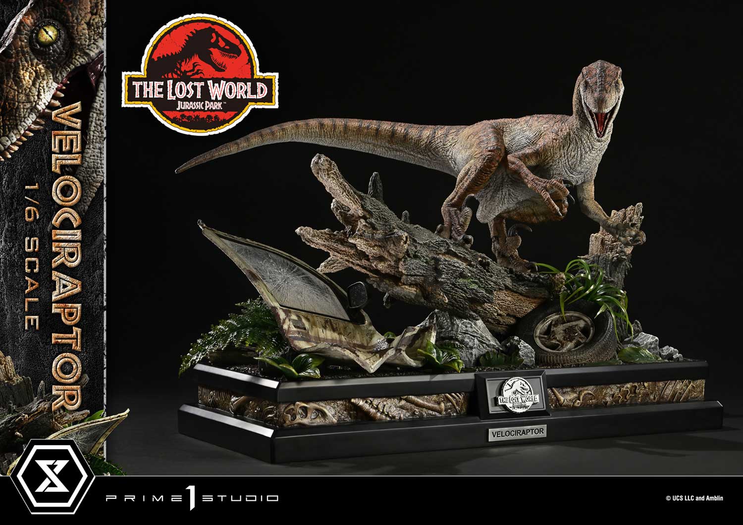 本次作品高約41公分,雕像透過精緻的刻畫,呈現牠肌理分明的肌肉與粗糙的鱗片質感。經典的虎紋配色 (Tiger Stripe Pattern) 以漸層灰米色為基底,搭配鮮明的橙色調,並覆以俐落的黑色條紋。雙眼散發著冷冽的黃光,垂直的瞳孔充滿壓迫感;張口之間可見血紅色的舌頭與鋒利齒列,前爪與鐮刀般的後趾爪更是細膩重現,完整展現迅猛龍的殘暴本性。本體搭配專屬設計的 通訊中心場景地台,帶有滿滿電影元素。斷裂的原木橫亙於地面,破碎的車門玻璃、鏽蝕的輪胎與散落的殘骸,皆忠實還原電影中的追擊場面。這不僅是一個底座,更是將觀者直接拉回《失落的世界》驚險時刻的沉浸式舞台。特典版追加一個迅猛龍爪化石展示模型,象徵牠們潛伏於草叢中伺機出擊的獵殺姿態,是收藏家不可錯過的限定加值配件。