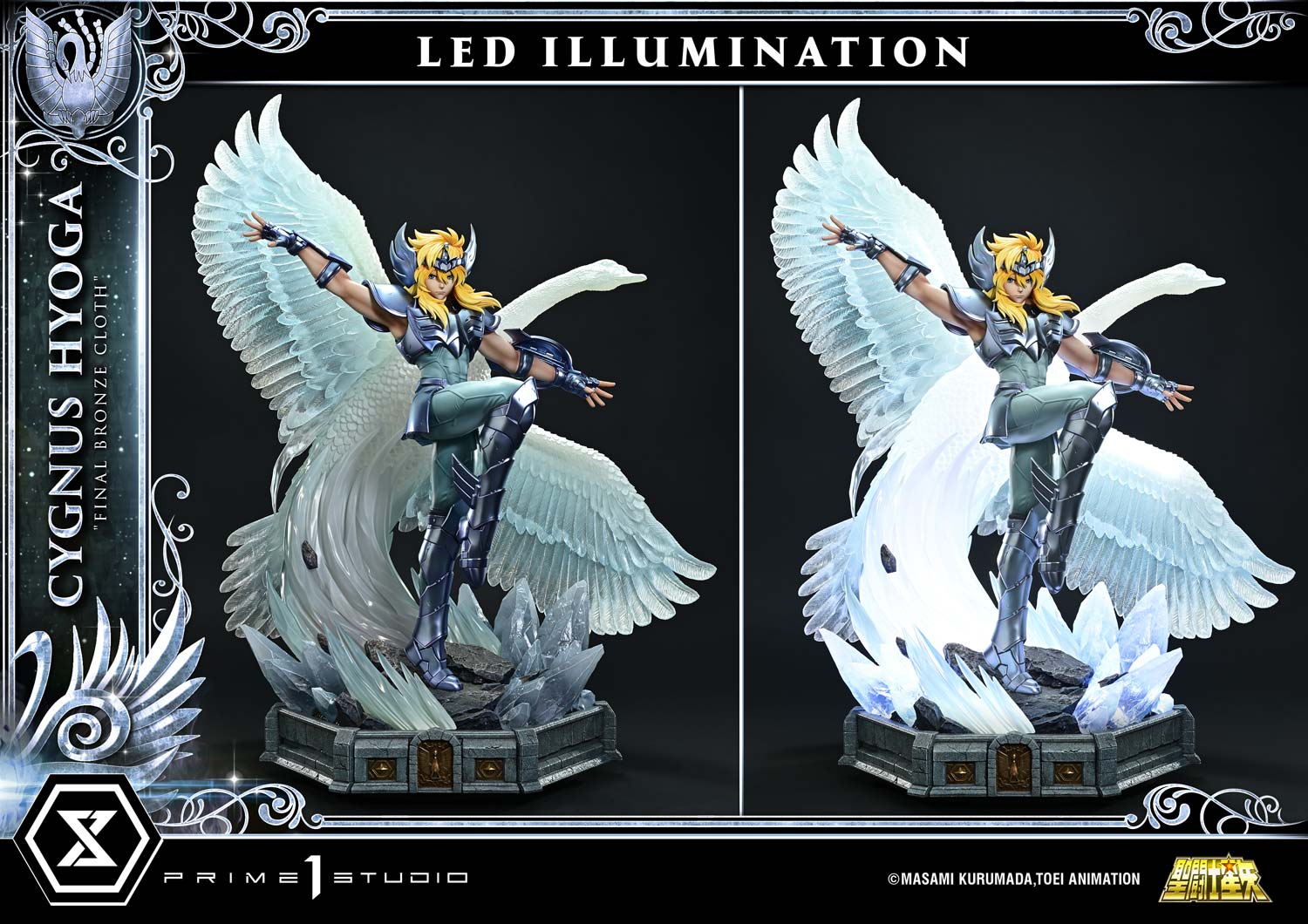 本次作品高約71公分,冰河以其經典的「最終青銅聖衣」姿態登場。雕像完美捕捉他施展招式「鑽石星塵(Diamond Dust)」瞬間的流動感——雙臂如冰刃般鋪展,右腿平舉至與地面平行,整體構圖形成象徵天鵝座的十字姿勢,展現出力與美的極致平衡。聖衣以細緻的銀藍色塗層再現經典質感。Prime 1 Studio 採用高精度雕塑與層疊式上色技術,使聖衣在光影之間展現宛如冰晶般的冷冽光澤。每一處線條、每一道金屬反射,皆展現職人工藝的極致追求。地台以「天鵝座」為主題,結合冰晶造型與壯麗的翅膀意象。冰河背後的巨大天鵝展翼而起,採用透明件製作,經由內建 LED 發光單元 釋放出淡藍色冰霜光輝,彷彿「小宇宙(Cosmo)」在流動。在特典版中,另附 原作漫畫風格頭雕,以車田正美老師筆下的神韻為靈感,重現漫畫中冰河冷峻而深情的表情。這款頭雕將原畫的強烈筆觸與立體造型完美融合,讓雕像更具收藏價值。