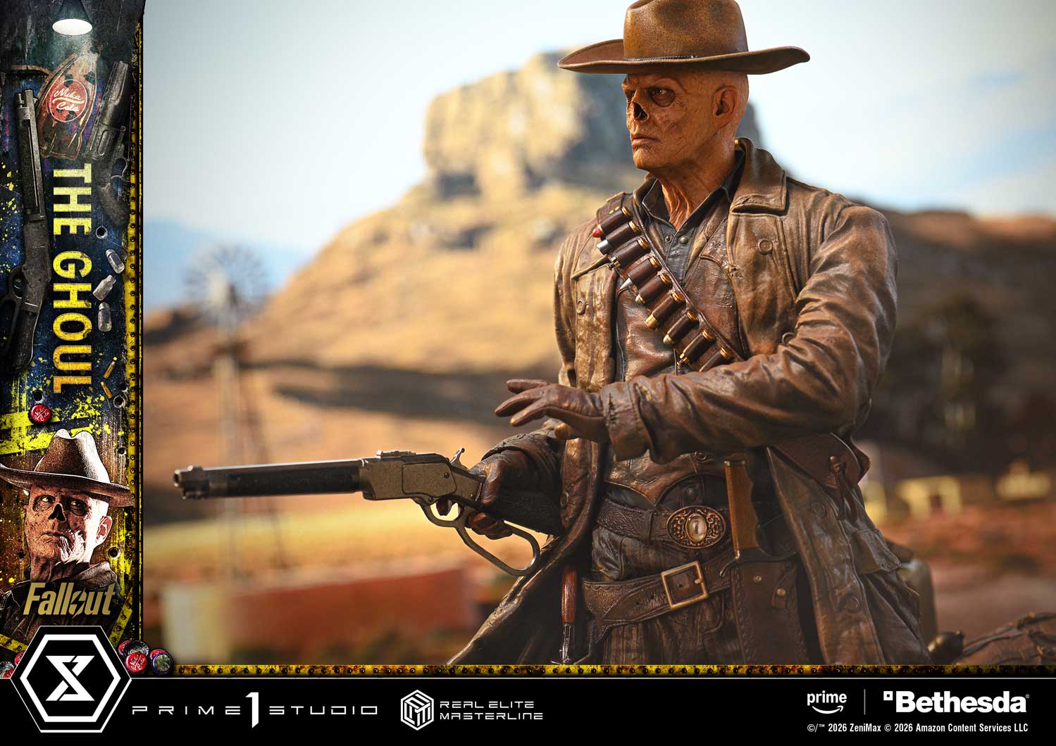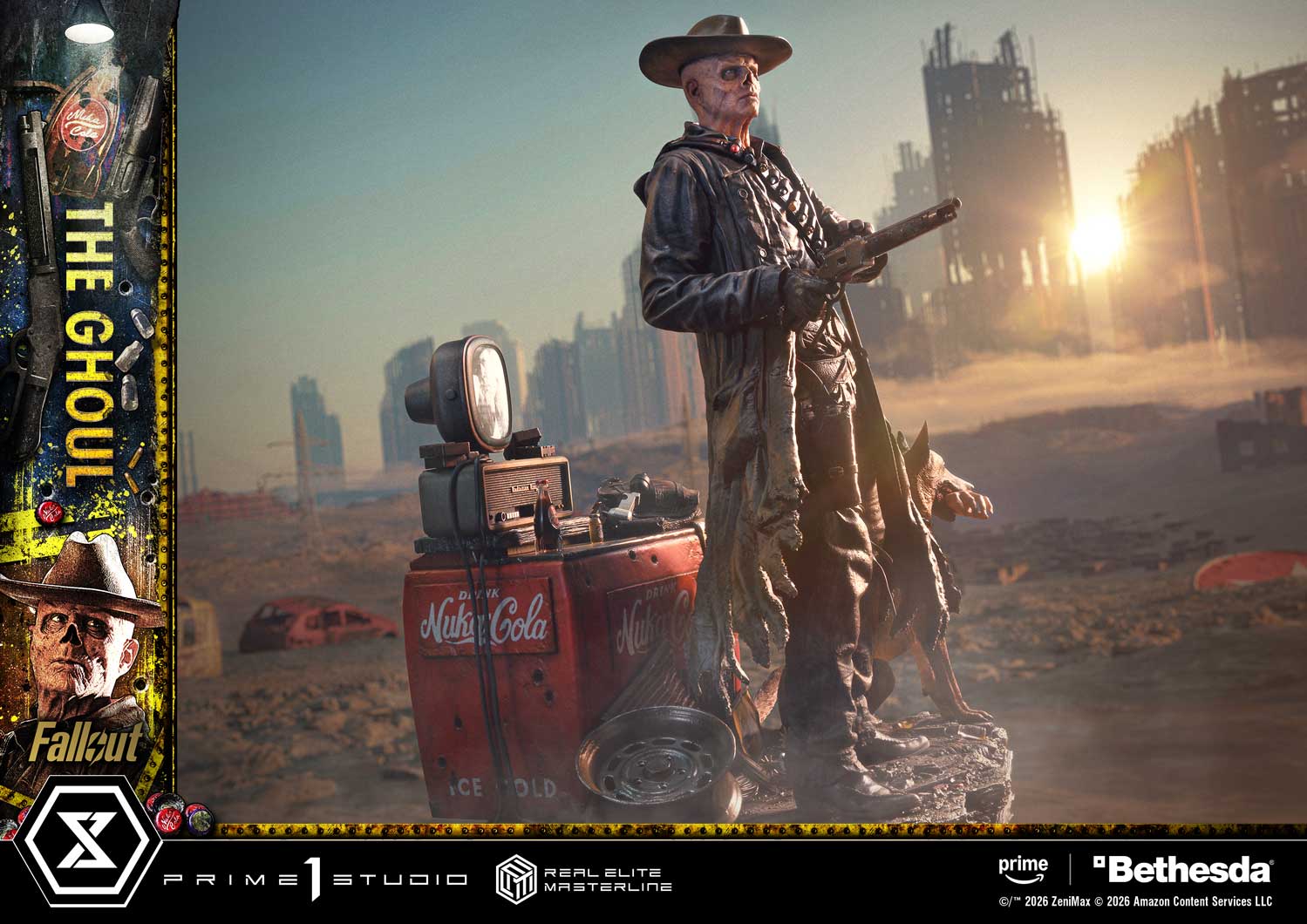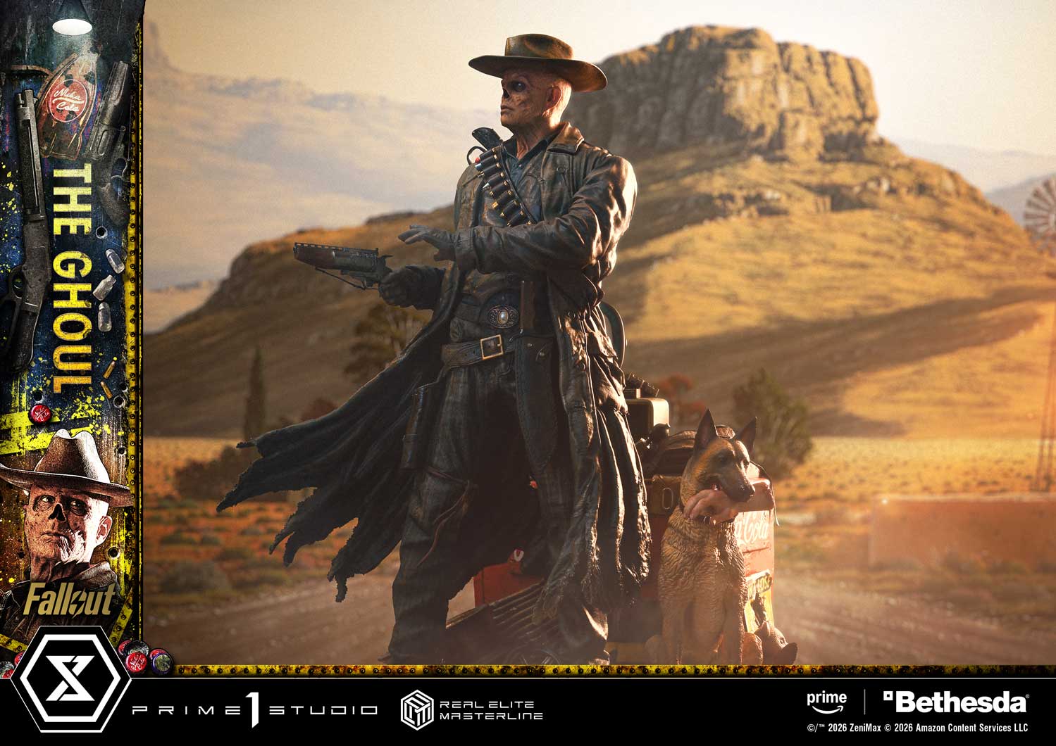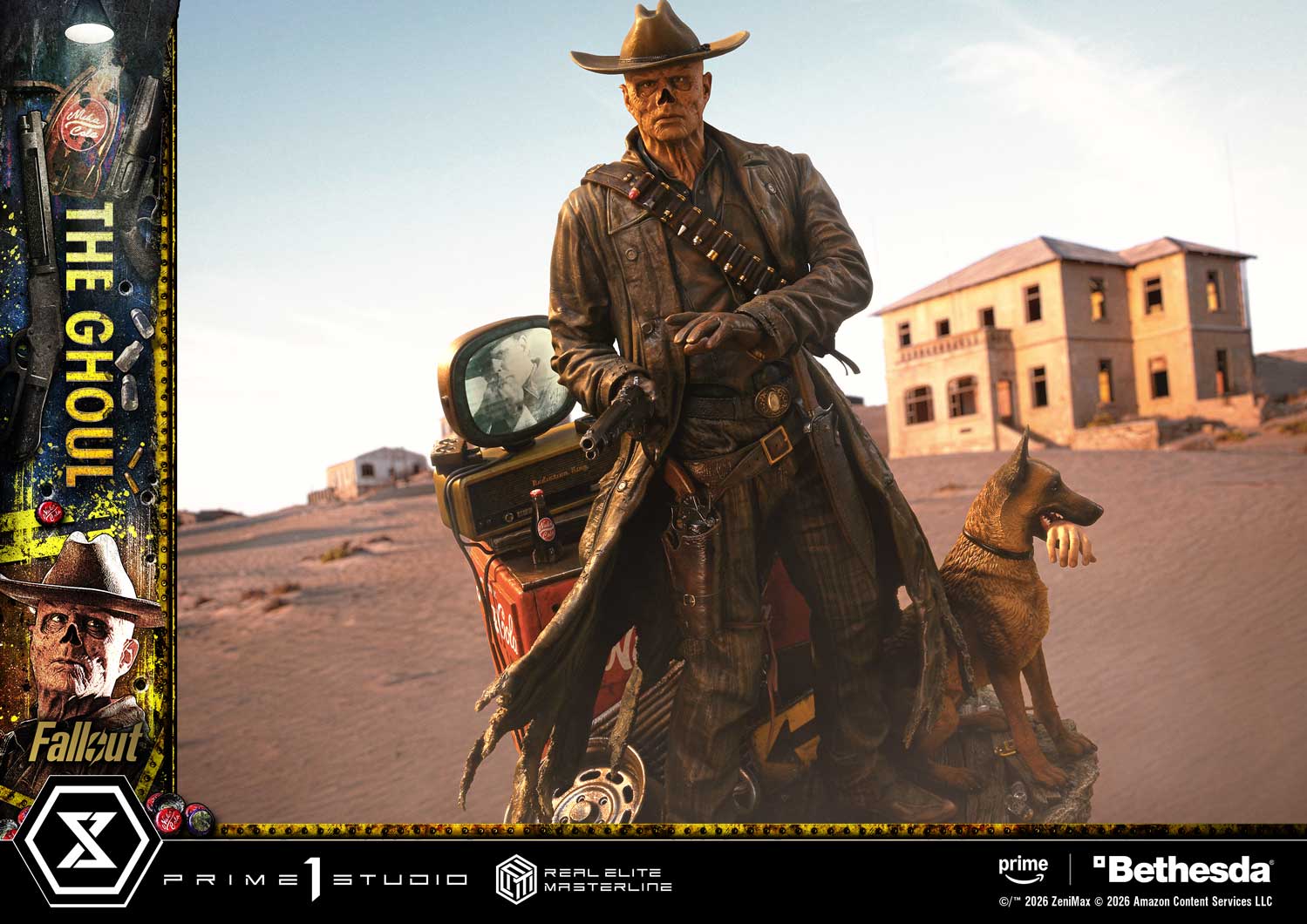本次作品高約64公分,以影集中著名的「菲利鎮槍戰」為靈感,他以腰射姿勢舉起左輪手槍,從軀幹的扭動、姿態的平衡,到左手掩護與扇擊的姿勢,都以極高密度的雕刻手法重現那一刻的緊張感與狠勁。他裸露的鼻腔、乾裂的皮膚、眼中冰冷無情的凶光,都被細膩捕捉。從風衣破損的纖維、皮革槍套的反光,到整體西部風格的做舊處理,每一吋細節都展現角色飽經風霜的荒原生命。並且透過替換零件,玩家也能將他切換為握持 拉槍式步槍(Lever-Action Rifle) 的戰鬥姿態。地台結合了影集中的多項象徵元素,組成一座饒富情節的場景:忠誠的 狗肉(Dogmeat)、鏽蝕的 Nuka-Cola 冰箱以及內建 LED 發光的復古電視機,電視機還播放著戰前的明星 Cooper Howard,每個物件都像被撿拾自荒原,將《異塵餘生》獨有的末世風格立體呈現。