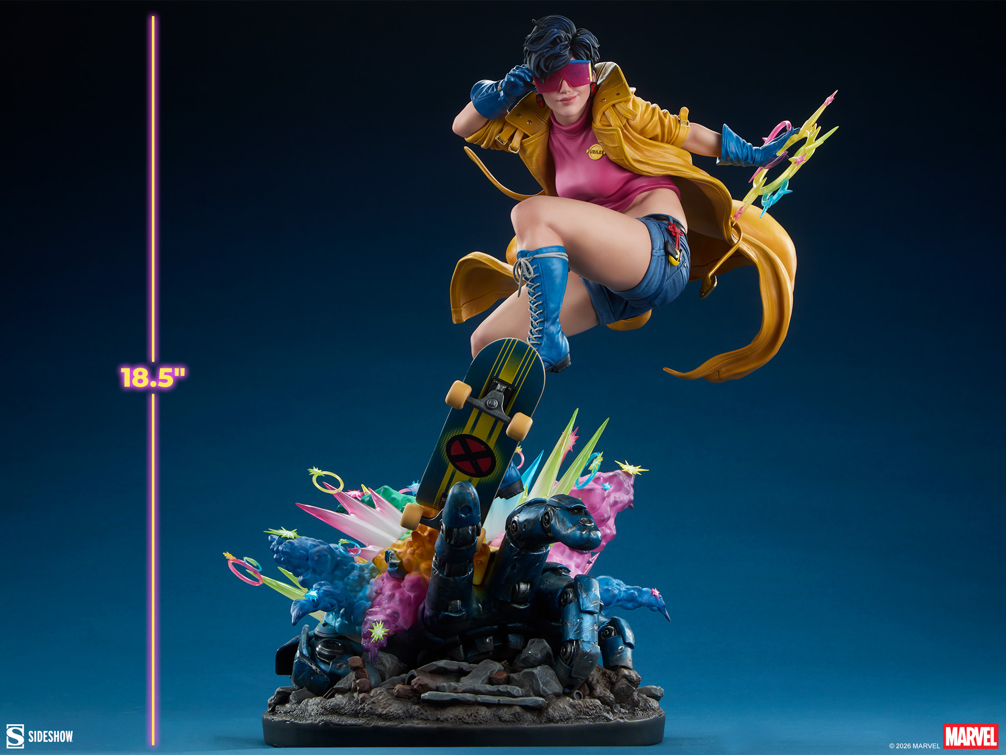 本次作品高約46.9公分,本作靈感來自 Marvel 漫畫中 1990 年代的經典造型,全雕塑設計忠實還原歡歡最具代表性的時尚風格,色彩對比鮮明、線條俐落,完美重現 90 年代 X 戰警漫畫的青春與街頭感。捕捉歡歡凌空躍起的瞬間,她踩著專屬滑板完成俐落的 ollie 動作,展現身為受過專業體操訓練的靈活動感。手中釋放出的星爆狀能量煙火,象徵她如節慶般耀眼的名字與性格——吵鬧、自信、永不退縮。地台呈現歡歡滑板落地瞬間引爆的能量場景,多色星狀煙火、電漿般的能量噴發向四周擴散,搭配 LED 燈效,營造出動感十足、充滿漫畫張力的畫面,完美襯托角色的速度感與爆發力。