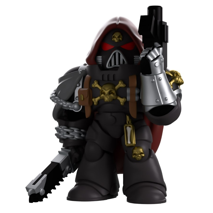 被囚禁一個世紀後,死亡守望泰圖斯的第一站是Youtooz!這款泰圖斯高5.1吋(約13公分),他側目而視,右手高舉爆彈手槍,左手緊握鏈鋸劍,深栗色斗篷遮住了他的頭部,並垂至背部。他雙目赤紅,身著漆黑的盔甲,胸前、額頭和左膝上飾有金色骷髏頭,腰間還垂掛著一根骨頭。棕色的肩帶環繞著他的雙肩,鎖鏈則纏繞著他的右肩甲和手臂。包裝盒外層是金色的拱形,深藍色內襯邊緣飾有金色線條。這種設計延伸至黑白相間的保護套,透過包裝盒正面的大型透明窗口,可以看到泰圖斯的身影。這款收藏品採用霧面壓紋保護外套和客製尺寸的塑膠保護盒包裝,以確保運輸過程中的最大程度保護。