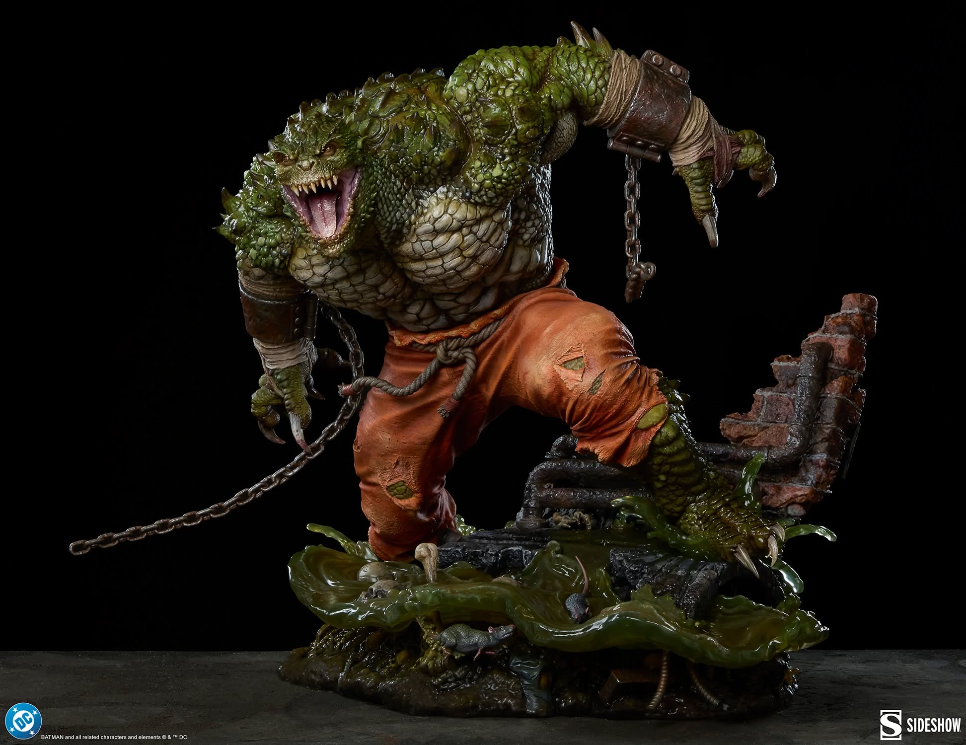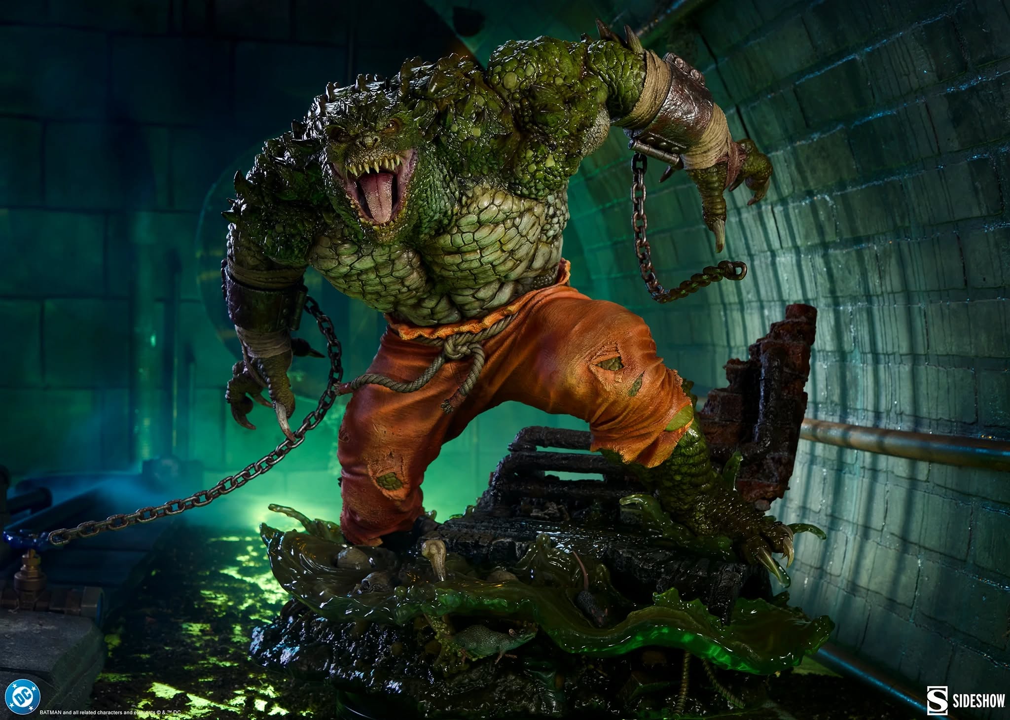 本次作品高約57公分,呈現殺手鱷在哥譚市下水道中狂暴橫行的瞬間。粗糙厚重的鱗片、充滿張力的肌肉線條,以及張開至極限的血盆大口,伴隨憤怒咆哮的表情,展現出野獸般的壓迫感。雙手仍帶著破裂的鐐銬與鎖鏈,搭配破損的橘色囚犯褲,暗示他剛從 阿卡漢精神病院 脫逃的設定。此外,本作還附有可替換右手配件(持水管),作為戰鬥中的兇器,搭配銳利獠牙與強悍尾巴,更添威脅性。地台以「哥譚市下水道」為核心概念打造,細節極其豐富:流動的綠色污水與黏稠液體效果、散落的骸骨與老鼠,營造陰暗骯髒氛圍、破裂磚牆與鏽蝕結構,強化場景真實感、隱藏於地台中的「班恩面具」等彩蛋元素。這些細節不僅呈現出殺手鱷的棲息環境,也暗示他過去戰鬥的痕跡與歷史。甚至連下水道標誌上的數字,都呼應角色在漫畫中的重要發行時間,極具收藏意義。