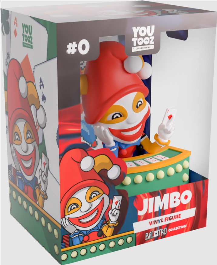 準備好開玩了嗎?你的運氣如何? !吉姆博(Jimbo)來到Youtooz,看看你能不能用他的首次亮相刷新你的最高分!他身高4.7吋(約11.9公分),坐在綠黃相間的撲克桌後,桌子前方透著柔和的燈光。他戴著手套的右手托著頭,白色的臉上塗著紅色和橘色的妝容,與頭上那頂三叉戟小丑帽的顏色相呼應。他左手手指間夾著一張方塊A,身穿一件紅藍橙三色相間的襯衫,領口飾有荷葉邊,邊緣垂著絨球,下身穿著五彩繽紛的褲子,旁邊放著三疊籌碼。包裝盒外側印著一副由A和一張小丑牌組成的撲克牌圖案,中間是一張小丑牌,而包裝盒內側則散落著撲克牌,背景是漩渦狀的藍色背景。背景隨後變為鮮豔的紅色,覆蓋在保護套上,透過包裝盒正面的大透明窗口可以看到吉姆博的身影。這款收藏品採用霧面壓紋保護外包裝和客製尺寸的塑膠保護套,以在運輸過程中提供最大程度的保護。