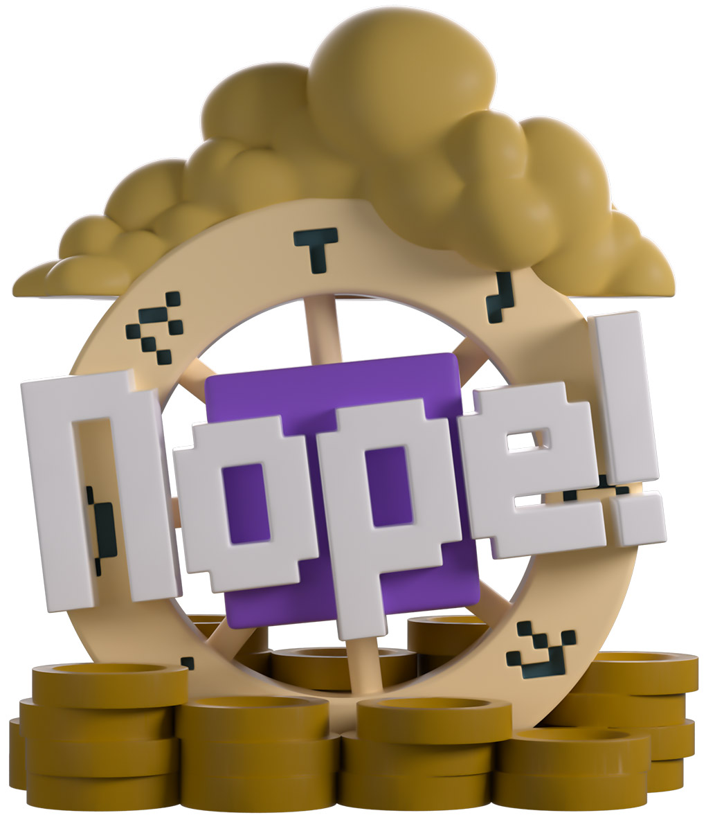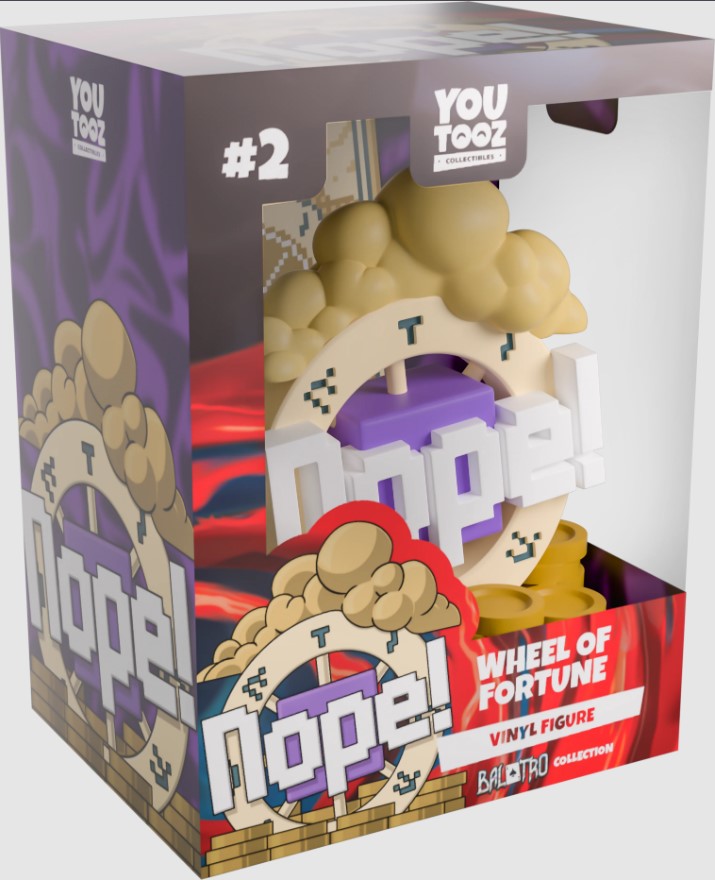 它會落在什麼上面呢?肯定很棒,我感覺到了!它高4.5英寸,靜靜地立在一堆隨意堆疊的金色籌碼之上。圓形的表面邊緣環繞著深色的紋路,中央一塊紫色方塊上赫然印著一個巨大的「不!」字樣,上方烏雲密布,預示著不祥之兆。包裝盒外層印著一副金色撲克牌,中央是「命運之輪」圖案;同樣的撲克牌散落在包裝盒內部,紫色背景漩渦翻滾。隨後,紫色背景逐漸變成鮮豔的紅色,覆蓋在保護套上,透過包裝盒正面的大透明窗口,可以看到它的身影。這款收藏品採用霧面壓紋保護套和客製尺寸的塑膠保護盒包裝,確保運輸過程中的最大程度保護。